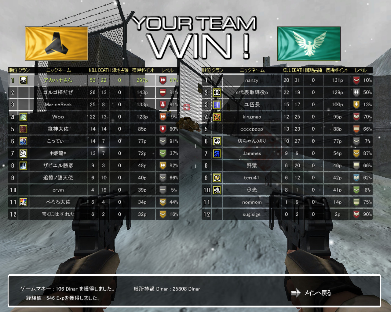Shadowさんうめーですわ。俺は性懲りも無くスナイパーのみでやってたんですが、あれ・・・?SRでKill取った記憶が・・・